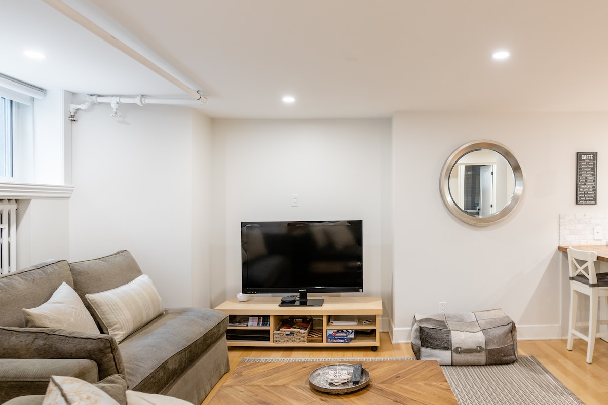 From the outside, this Montreal Airbnb is a sweet, two-story brick townhouse with a small front yard. Inside, it has space for three guests. The design is simple and no-fuss but doesn’t skimp in the areas that visitors treasure most – a well-equipped kitchen, a laundry closet, a comfy bed, and a cozy and stylish living room.
