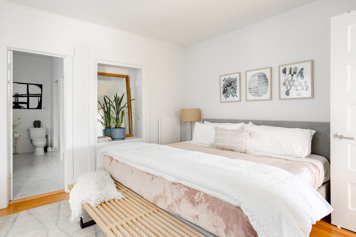 Ideal for solo travelers and couples, the spacious one-bedroom apartment is furnished with a luxurious queen-size bed with plush pillows and sumptuous throws. The interior is characterized by soft gray tones, minimalist décor, and black-and-white artwork, and the cozy living room is equipped with a soft white sofa and a Smart TV. Additional features include a full bathroom with a spa-like rain shower and a full kitchen with bright white cabinetry and a two-person breakfast bar. The host is known for his impressive response rate and warm hospitality, and the apartment is so comfortable that many previous guests have found themselves returning for a second or third time. The apartment is nestled in a spacious and modern home with one other unit, and guests have exclusive access to the apartment through a private entrance.