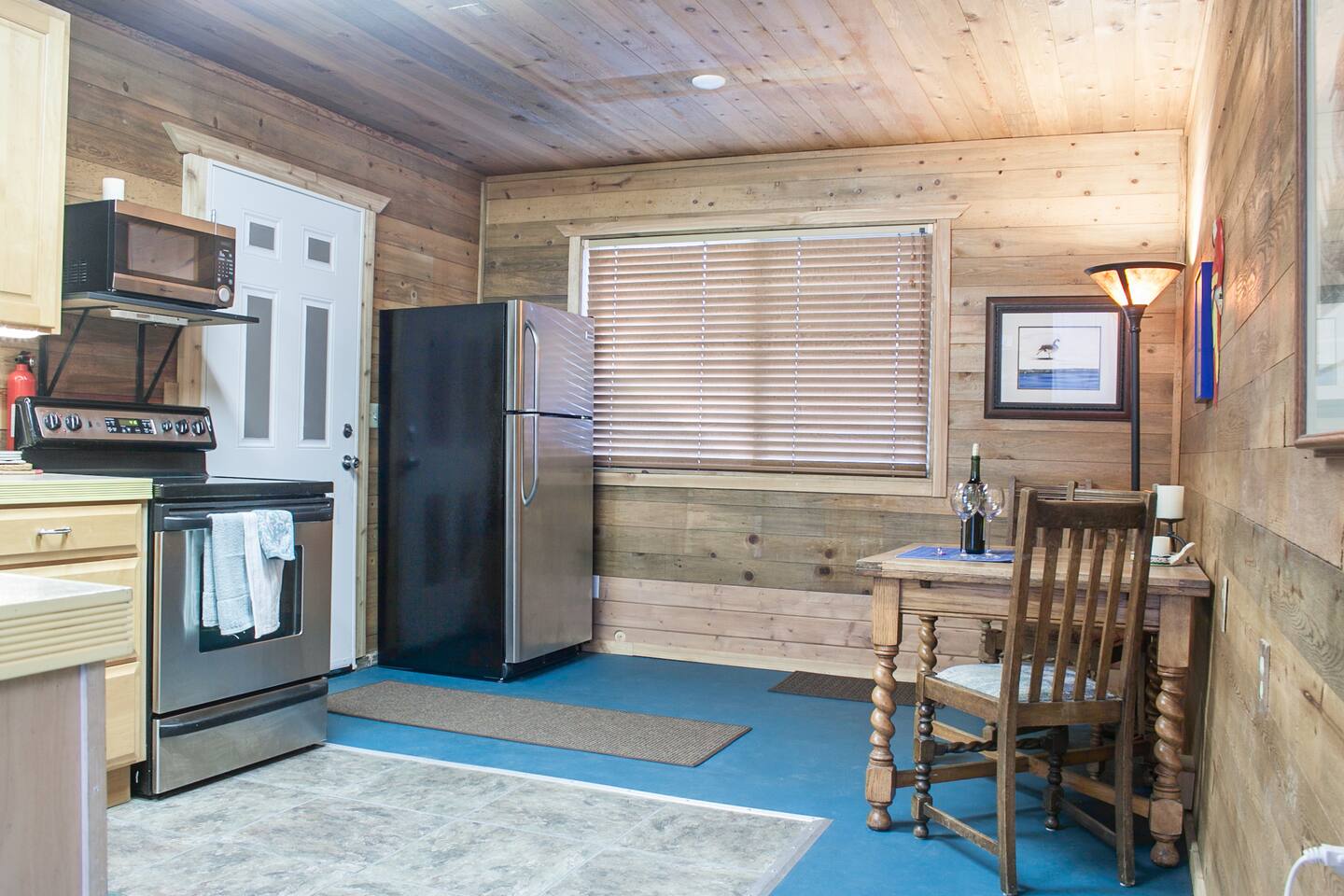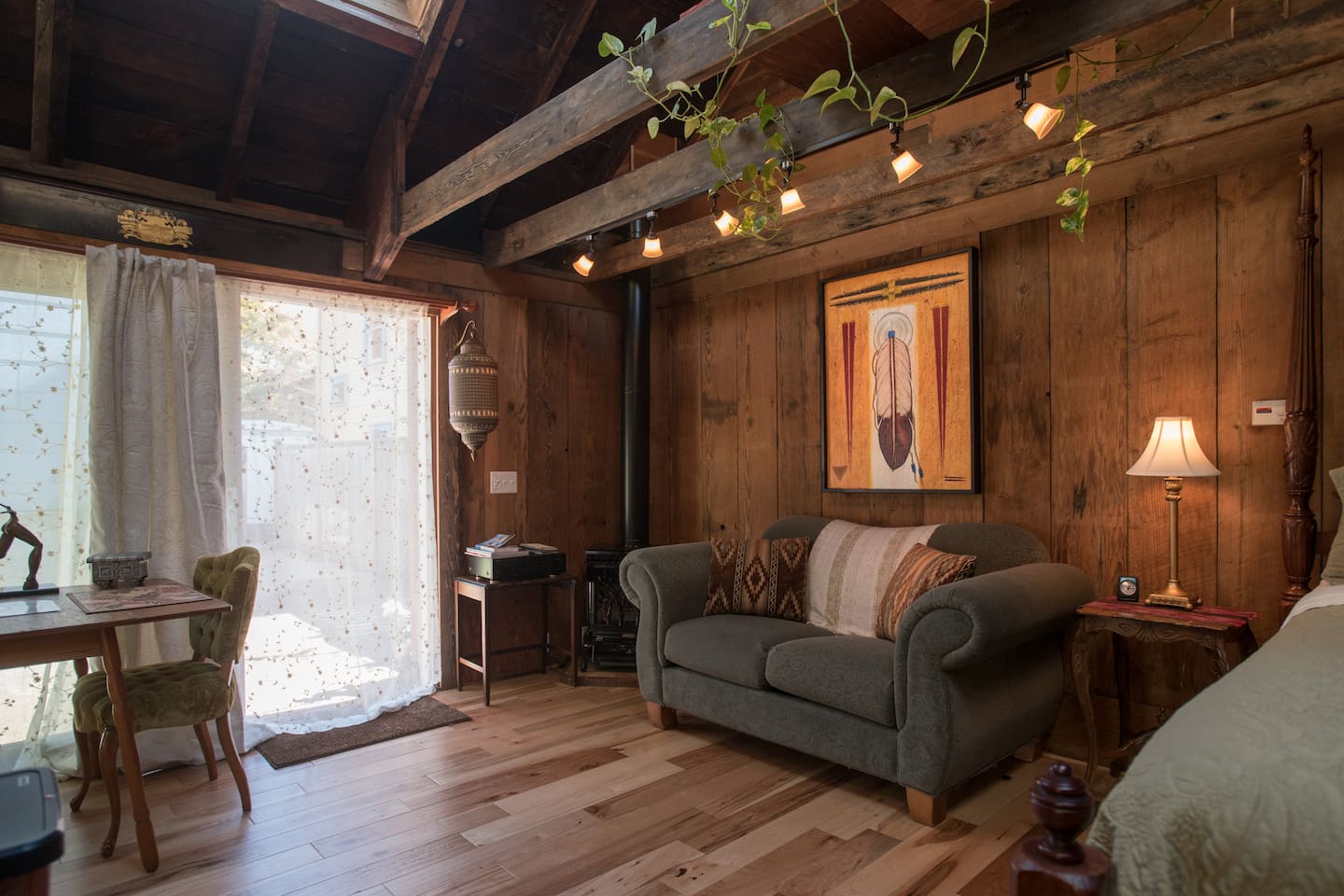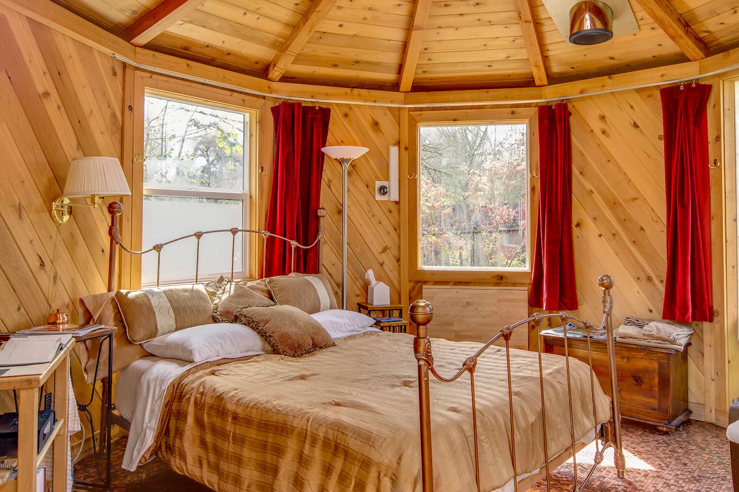 This little cabin in superhost Don’s yard is a great pick if you’re after something a little different for your next trip. Made of cedar and glass, the house is just large enough to fit a memory foam queen bed, a small table, and a chair inside. It is comfortable, though, with heating, cooling, and room-darkening curtains for privacy and sleeping in.