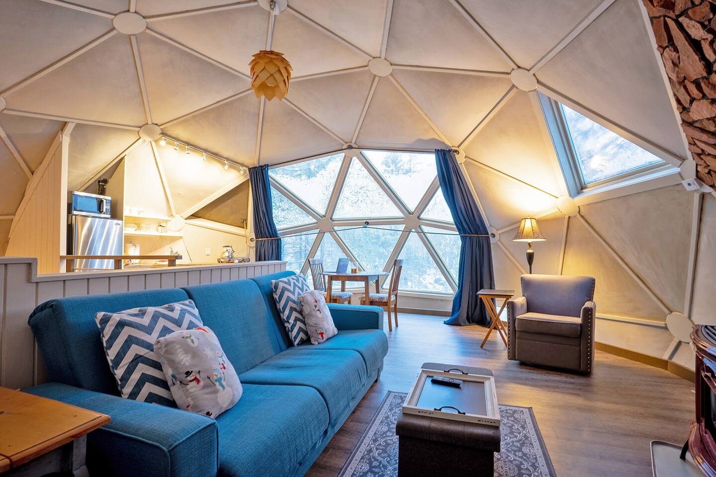On the practical side, the dome features a handy kitchen with a stove, fridge, microwave, and dishwasher, while there’s a barbecue grill outside. Perhaps more impressive is that you have access to a washer and dryer, making long stays here quite viable. Comforts like the indoor fireplace, air conditioning, Wi-Fi, and a smart TV will really make you feel at home.